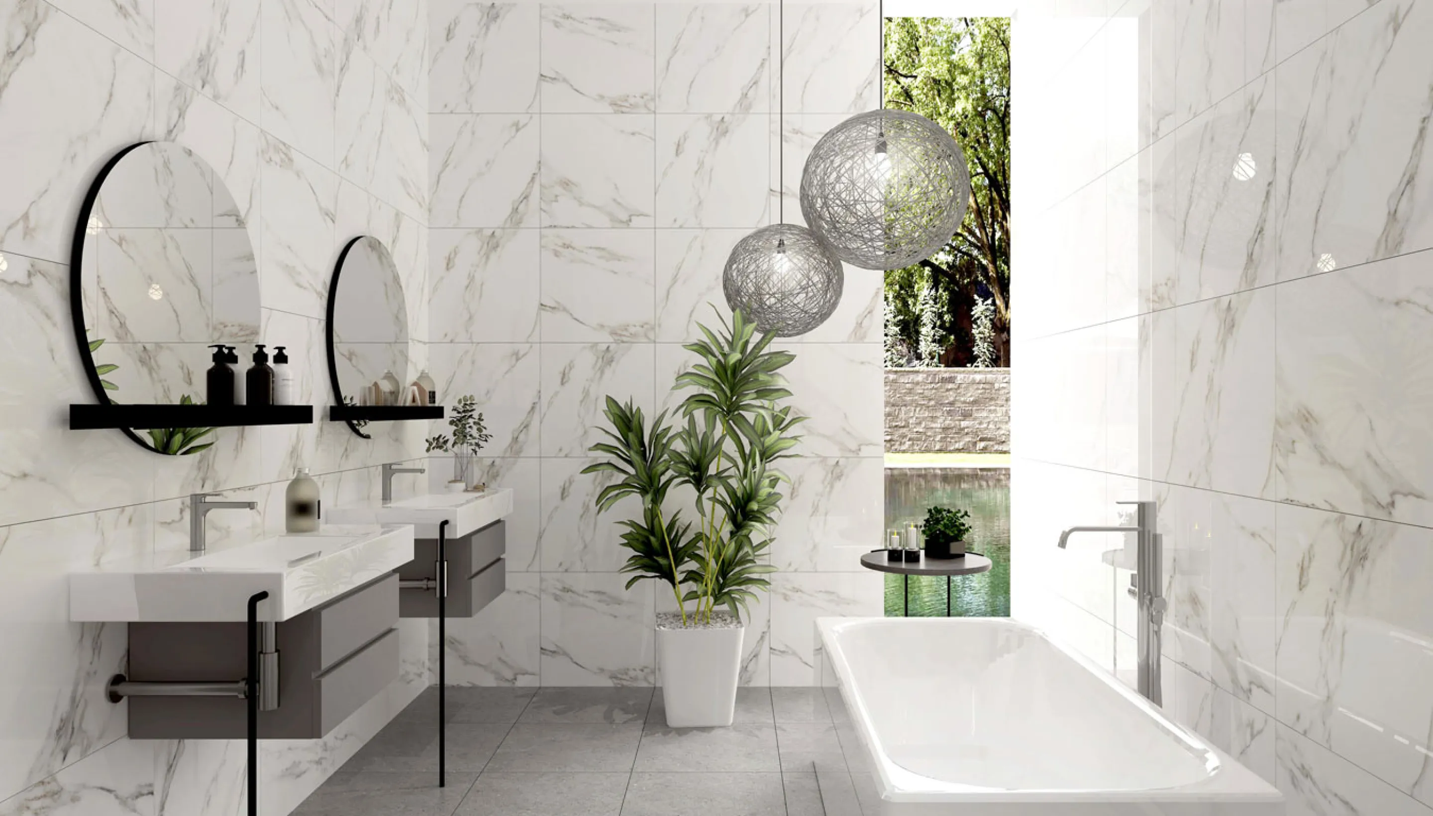 Lecce tiles showcase a luminous white surface accented by soft grey and warm beige veining. The glossy finish enhances depth and light, creating an elegant marble expression that brings clarity, luxury, and enduring sophistication to any interior.